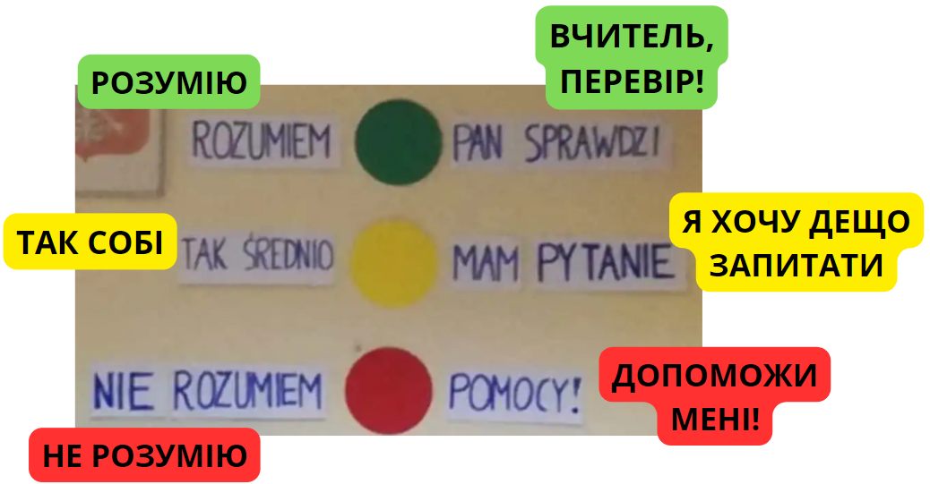 - Ти можеш попросити товариша з лави пояснити тобі щось. Ти також можеш допомогти комусь, коли вони потребують допомоги. Для цього є місце на уроці – це чудово, коли ми можемо вчитися один у одного!